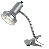 This flexible clip light helps out with whatever task you're working on. It's perfect for reading, studying, crafts and other tasks. Flexible gooseneck lets you aim the light throw, while the clip lets you position this lamp wherever you need it. Comes in a sleek silver finish. On/off twist knob is conveniently located at the back of the fixture. Uses either a standard 60 watt light bulb or 50 watt PAR20 (bulbs not included). Spring clip extends to 1 1/2" wide. 12 1/2" max height. Head is 4" wide, 6" deep. Clip is 4 3/4" deep.