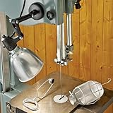 Interchangeable magnetic and spring clamp bases allow you to use this light almost anywhere! 360degrees; swivel head and jointed arm adjust to light any work area.Up to 60 watts of light (bulb not included). Complete with 18 ft. cord, heavy duty switch, vented metal reflector shield, and "bird cage" bulb protector.Shop Tip: We screwed metal, electrical junction box cover plates to walls and joists around the shop and garage to utilize the magnetic base on non-magnetic surfaces.
